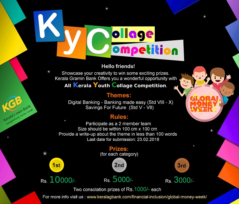Global Money Week celebrations (http://www.globalmoneyweek.org) was instituted by Child & Youth Finance International, Amsterdam ( https://childfinanceinternational.org) in order to create an awareness about the need for financially including the youth. KGB has participated in GMW celebration for the first time, in 2017. This year also, we are associating with GMW Celebrations which is during 12 – 18 March, 2018. The theme for the current year celebrations is “Money Matters Matter”. We are organizing an all Kerala collage competition for school children namely KYC (all Kerala Youth Collage competition on banking).